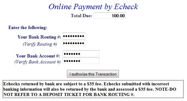 Pay by e-Check - Input Bank Routing and Account Number and Verify Routing and Account Number. See check images below if you are unsure of Bank Routing and Account Numbers. After e-check information is entered, press I Authorize this transaction after reading the important message below the button. |